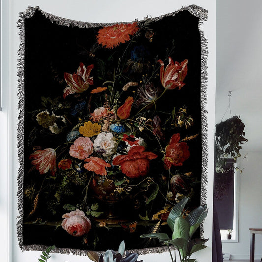 Baroque Floral 100% Cotton Woven Blanket, Gothic Victorian Botanical Art Wall Hanging Tapestry, Cozy Throw, Dark Romantic Vintage Garden Wall Decor, Moody Couch Accent