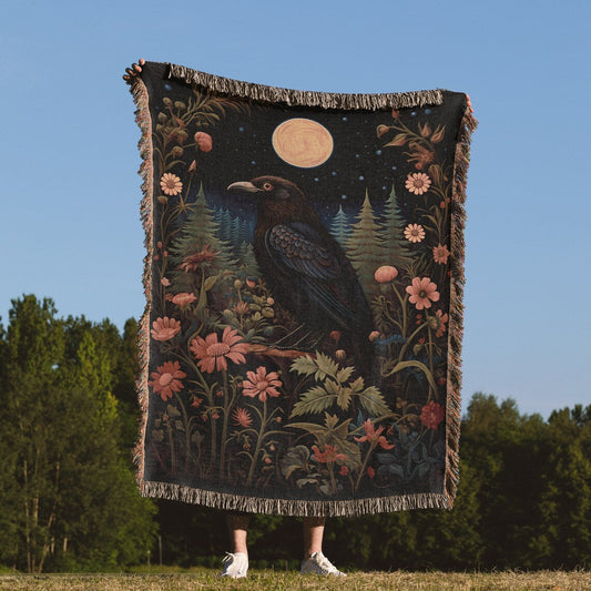 Raven 100% Cotton Woven Blanket, Gothic Floral Forest Wall Hanging Tapestry, Cozy Throw