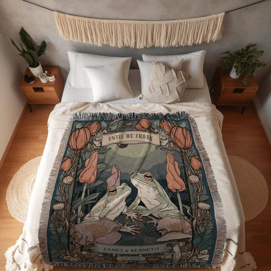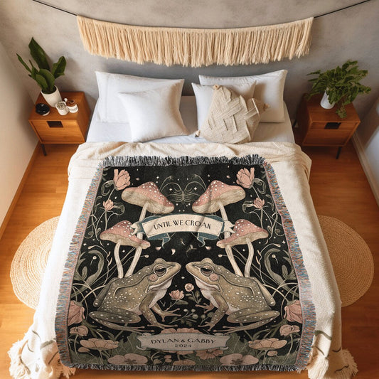 Until We Croak Frog Couple 100% Cotton Woven Blanket, Woodland Mushroom Gothic Wall Hanging Tapestry, Cozy Throw, Personalized Anniversary Cottagecore Gift for Frog Lover