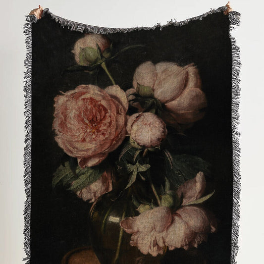 Moody Pink Floral 100% Cotton Woven Blanket, Dark Romantic Botanical Wall Hanging Tapestry, Cozy Throw, Vintage Cottagecore Decor, Heirloom Gothic Garden Couch Accent