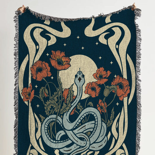 Celestial Snake 100% Cotton Woven Blanket, Floral Moon Wall Hanging Tapestry, Cozy Throw, Witchy Occult Decor