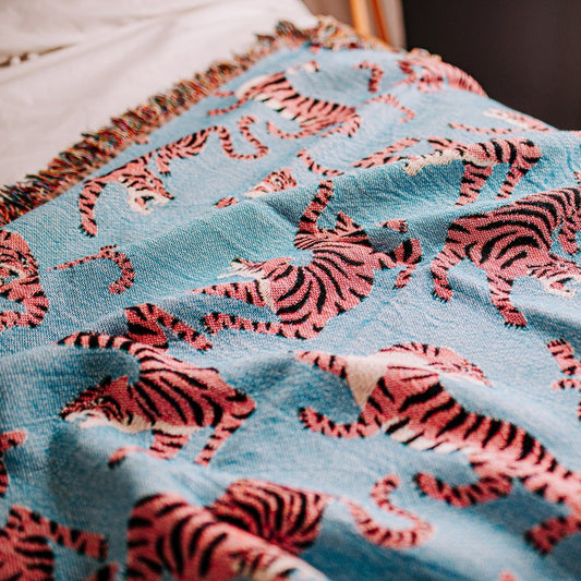 Pink Tiger 100% Cotton Woven Blanket, Wall Hanging Tapestry, Cozy Throw