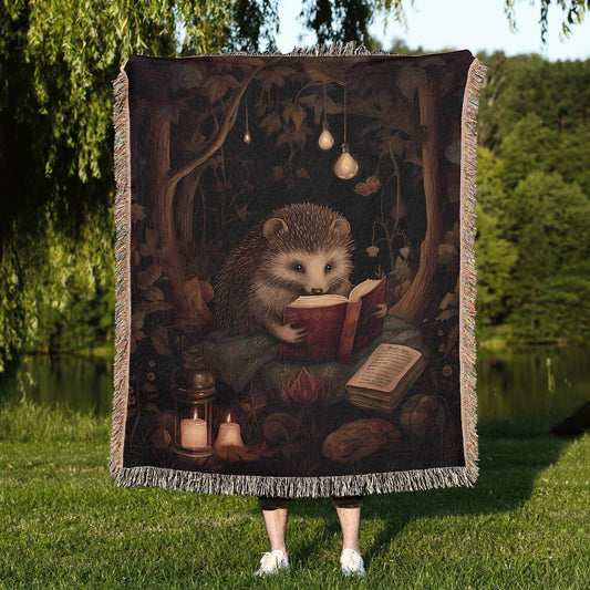 Hedgehog Reading 100% Cotton Woven Blanket, Wall Hanging Tapestry, Cozy Throw, Whimsical Cottagecore Decor