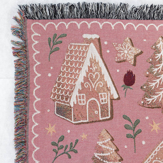 Pink Gingerbread Christmas 100% Cotton Woven Blanket, Holiday Winter Wall Hanging Tapestry, Rustic Farmhouse Xmas Decor Cozy Throw, Festive Gift