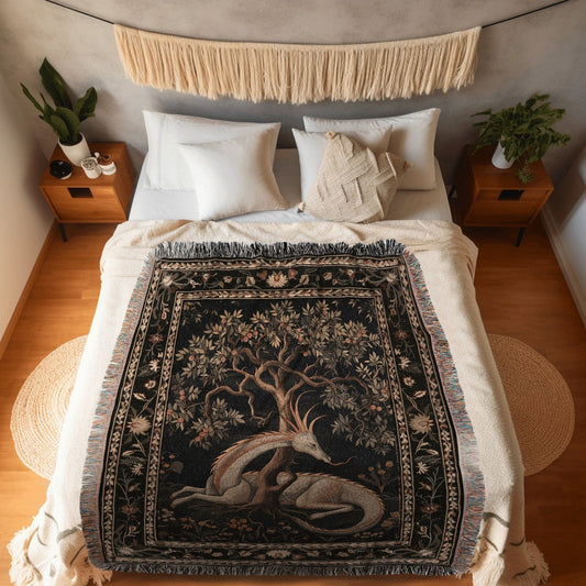 Dragon 100% Cotton Woven Blanket, Mysticism Gift Fairycore Wall Hanging Tapestry, Enchanted Aesthetic Cozy Throw, Artful Fantasy