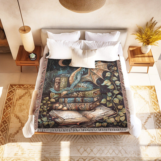 Bookish Dragon 100% Cotton Woven Blanket, Folklore Wall Hanging Tapestry, Cozy Throw
