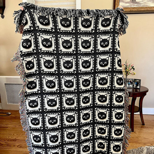Cat Granny Square 100% Cotton Woven Blanket, Wall Hanging Tapestry, Cozy Throw, Halloween Fall Autumn, Dorm College Student Teen Cat Mom