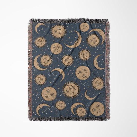 Celestial 100% Cotton Woven Blanket, Retro Sun & Moon Wall Hanging Tapestry, Cozy Throw