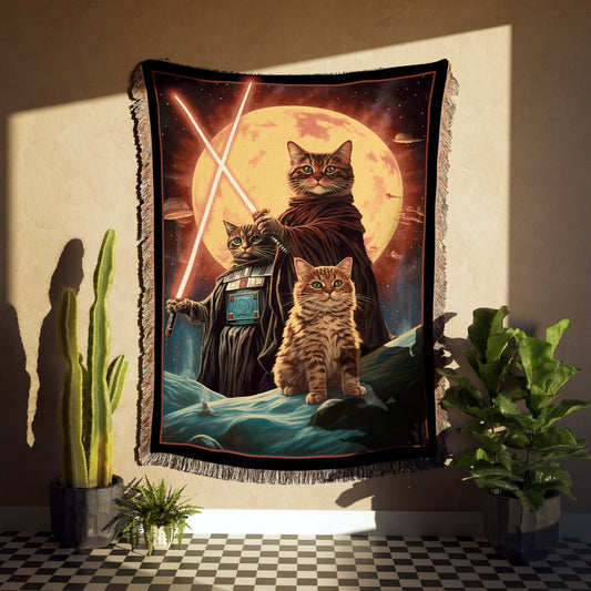 Cats Wars 100% Cotton Woven Blanket, Wall Hanging Tapestry, Cozy Throw, Sci-Fi Cat Lover Gift