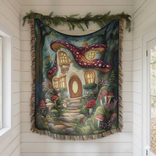 Mushroom 100% Cotton Woven Blanket, Cottagecore Fantasy Wall Hanging Tapestry, Cozy Throw