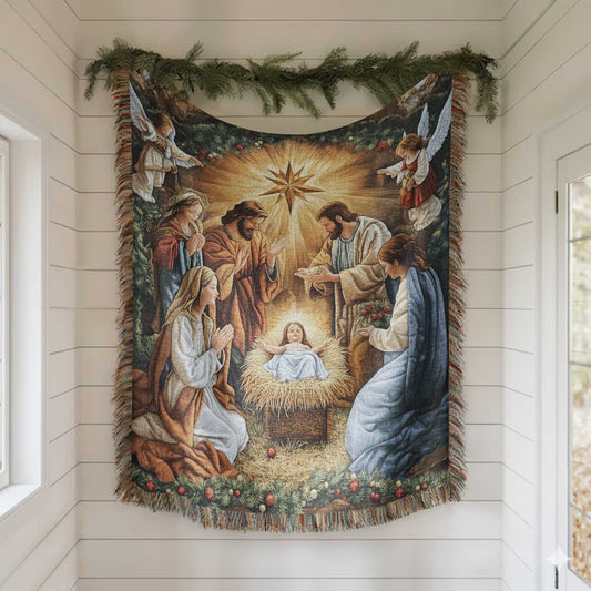 Nativity Faith Christmas 100% Cotton Woven Blanket, Holiday Wall Hanging Tapestry, Cozy Throw, Festive Gifts