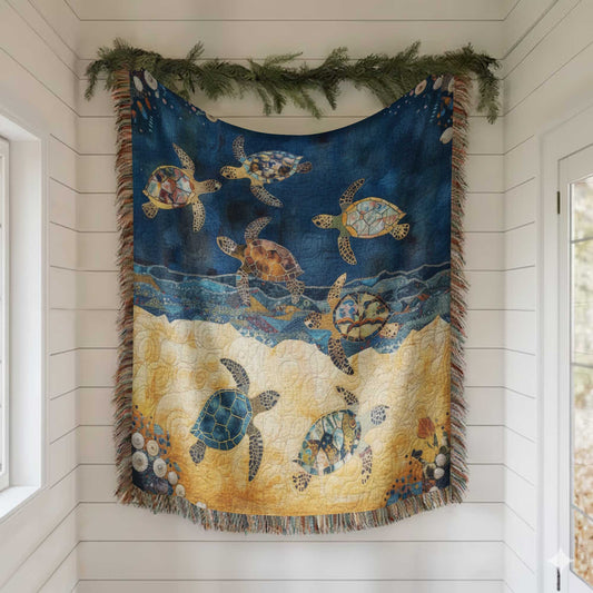 Sea Turtle 100% Cotton Woven Blanket, Coastal Cottagecore Wall Hanging Tapestry, Cozy Throw