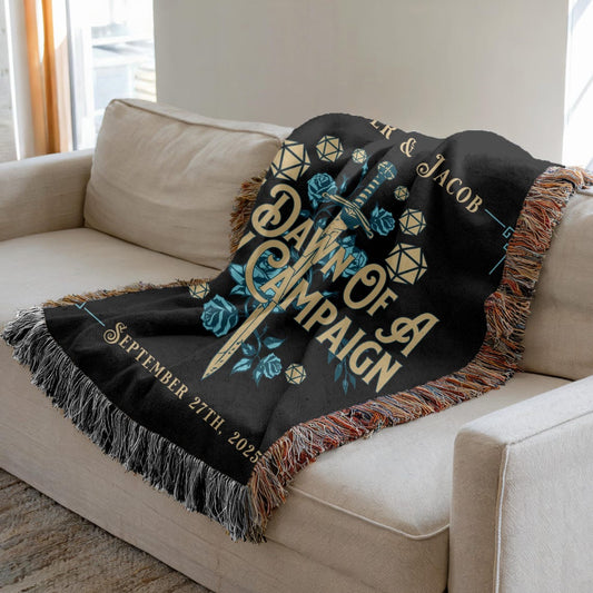 Gamer Couple 100% Cotton Woven Blanket, Wall Hanging Tapestry, Cozy Throw, Nerdy Wedding Anniversary Gift, Sword Dice Dragons Marriage