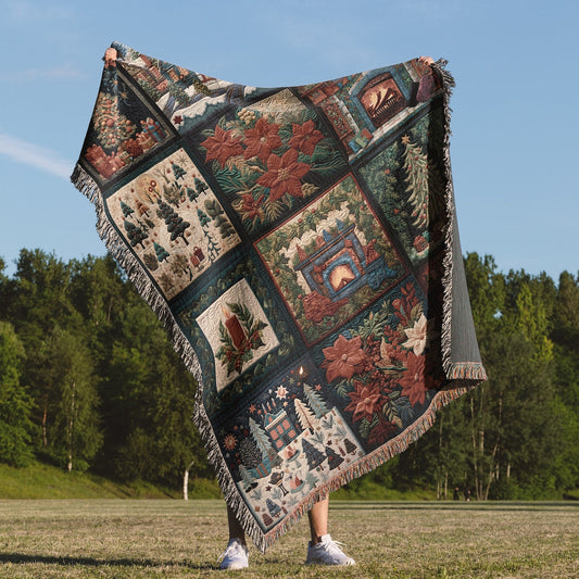 Vintage Christmas Patchwork 100% Cotton Woven Blanket, Holiday Winter Wall Hanging Tapestry, Rustic Farmhouse Xmas Decor Cozy Throw, Festive Gift