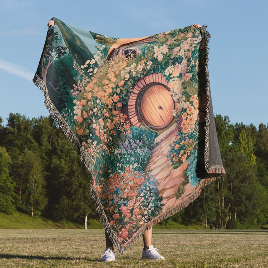 Floral Hobbit Hole 100% Cotton Woven Blanket, Whimsical Woodland Forest Wall Hanging Tapestry, Bookish Cozy Throw, Cottagecore Kids Room Decor, Fantasy Home Design