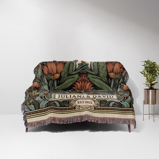 Frog Couple 100% Cotton Woven Blanket, Personalized Anniversary Gift Custom Name Wall Hanging Tapestry, Woodland Cozy Throw, Cottagecore Wedding Gifts