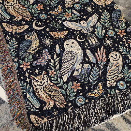Mystical Owl 100% Cotton Woven Blanket, Celestial Crystals & Moths Wall Hanging Tapestry, Cozy Throw