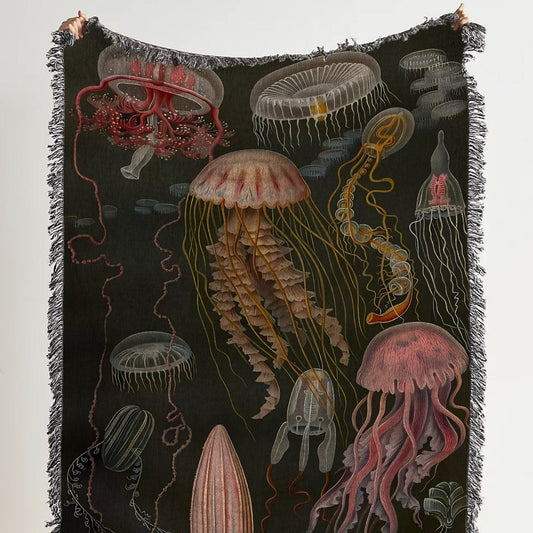 Jellyfish 100% Cotton Woven Blanket, Vintage Nautical Coastal Ocean Wall Hanging Tapestry, Cozy Throw, Beach House Sea Life Decor